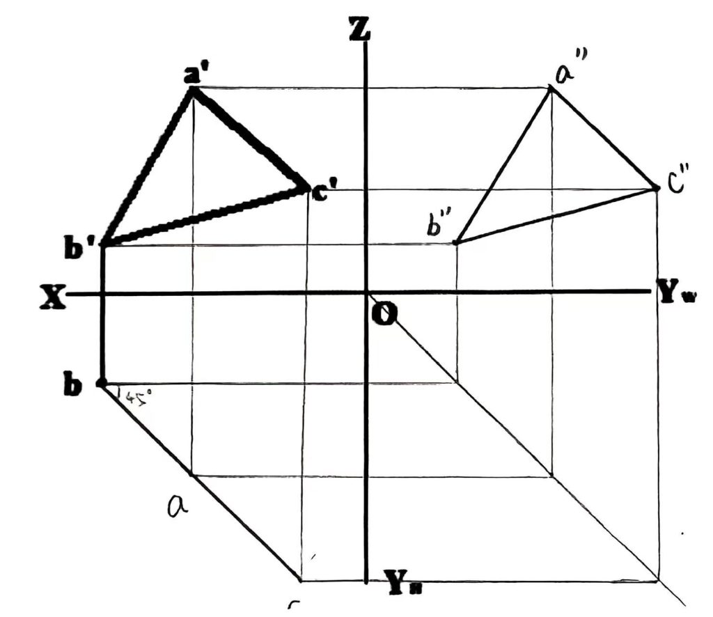 3、已知△ABC为铅垂面与V面顺时针方向的夹角为45°,并已知△ABC的正面投影△a’b’c’和点B的水平投影b,求△ABC另外两面的投影。(请保留作图线)。(30分)