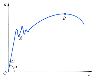 某种材料的标准试样标距为100mm,其轴向拉伸实验得到的应力-应变曲线如图所示。图中各点坐标为:点A(88×10-4,240MPa),点B(1776×10-4,380MPa),点C(9×10-4,180 MPa)。(1)求材料的弹性模量;(2)若试样断后标距为126.5mm,求延伸率并判断材料是脆性材料还是塑性材料。